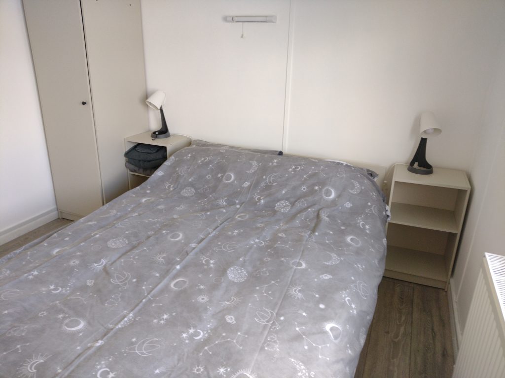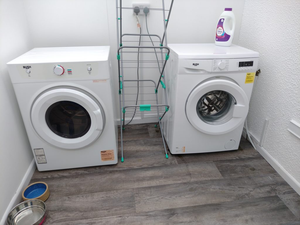 - Kitchen with electric oven and hob, microwave, fridge, freezer